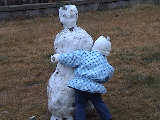 Hugging her new friend, the snowman. She actually cried for several minutes when we took her back inside.
