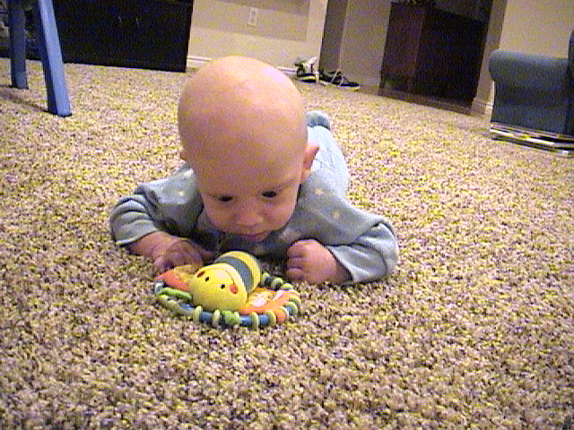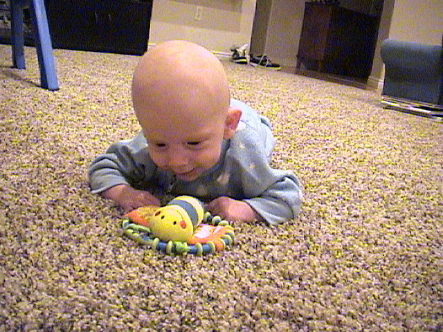 On his tummy with his favorite rattle