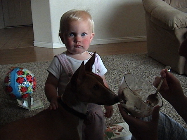Eating pudding and petting the dog