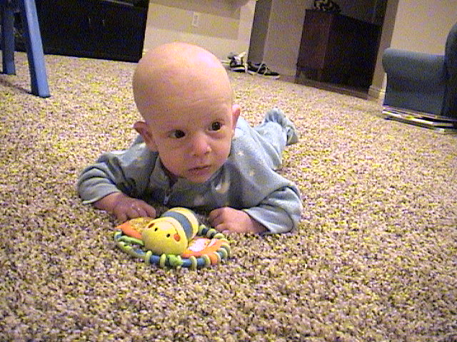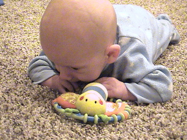 On his tummy with his favorite rattle
