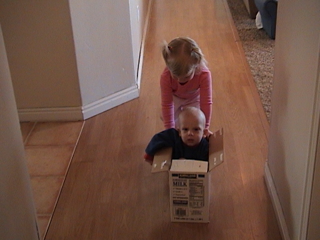 I put Sammy in the milk box just to see his reaction. He seemed to like it, so I told Bethany to watch him and make sure he didn't fall over. She decided to push him around.